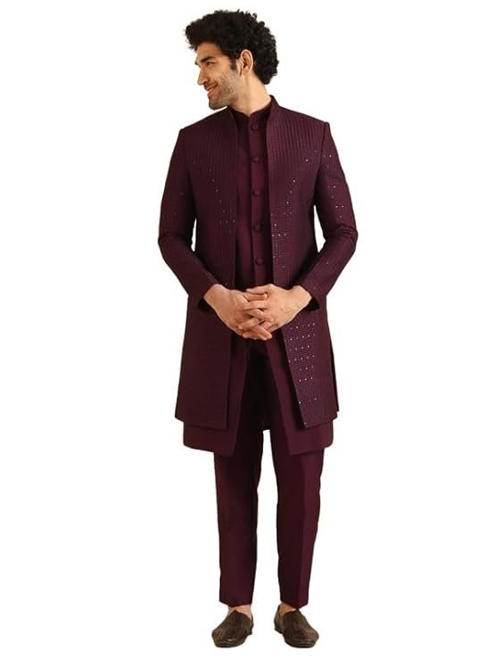 Men’s Indo-Western Waistcoat Sherwani Trouser Set, Wine Blended, Embellished Regular Fit Mandarin Collar Long Sleeves